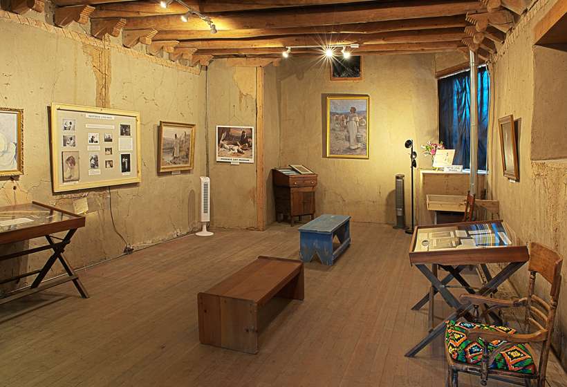 In 1908 Sharp established a permanent home in Taos, buying a house on Kit Carson Road. The next year he bought land to the east, including an old Spanish chapel that he converted into a studio. Sharp's chapel studio was originally built as a family chapel by Juan de Luna around 1835. It later passed to the Diocese in Santa Fe, from whom Sharp bought it. He called it "The Studio of the Copper Bell" and used it for six years, before building a larger studio on adjacent land to the south. After 1915 Sharp used his old studio, the Luna Chapel, for storage, installing a vault in one corner to protect his paintings and large artifact collection when he was away. He had stock in a failed bank and acquired the vault door as a result.